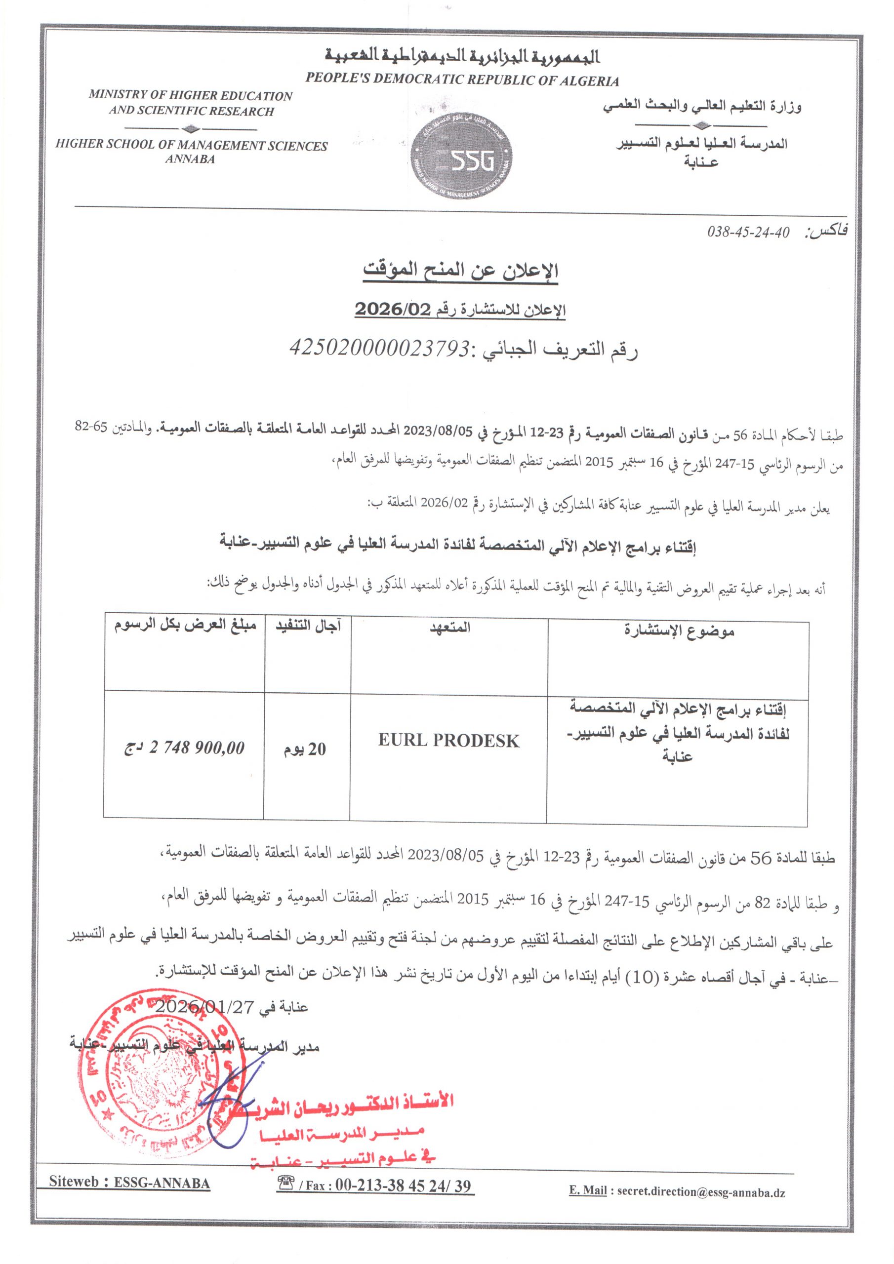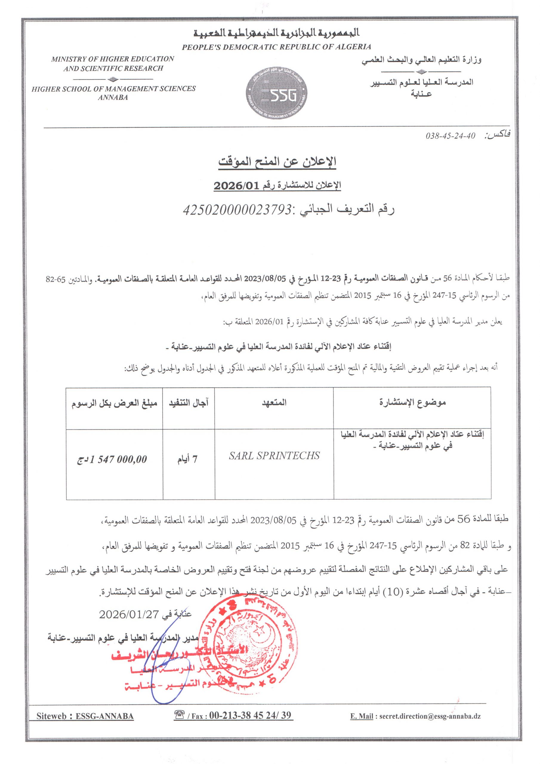- الإعلان عن المنح المؤقت للإستشارة رقم 2025/01