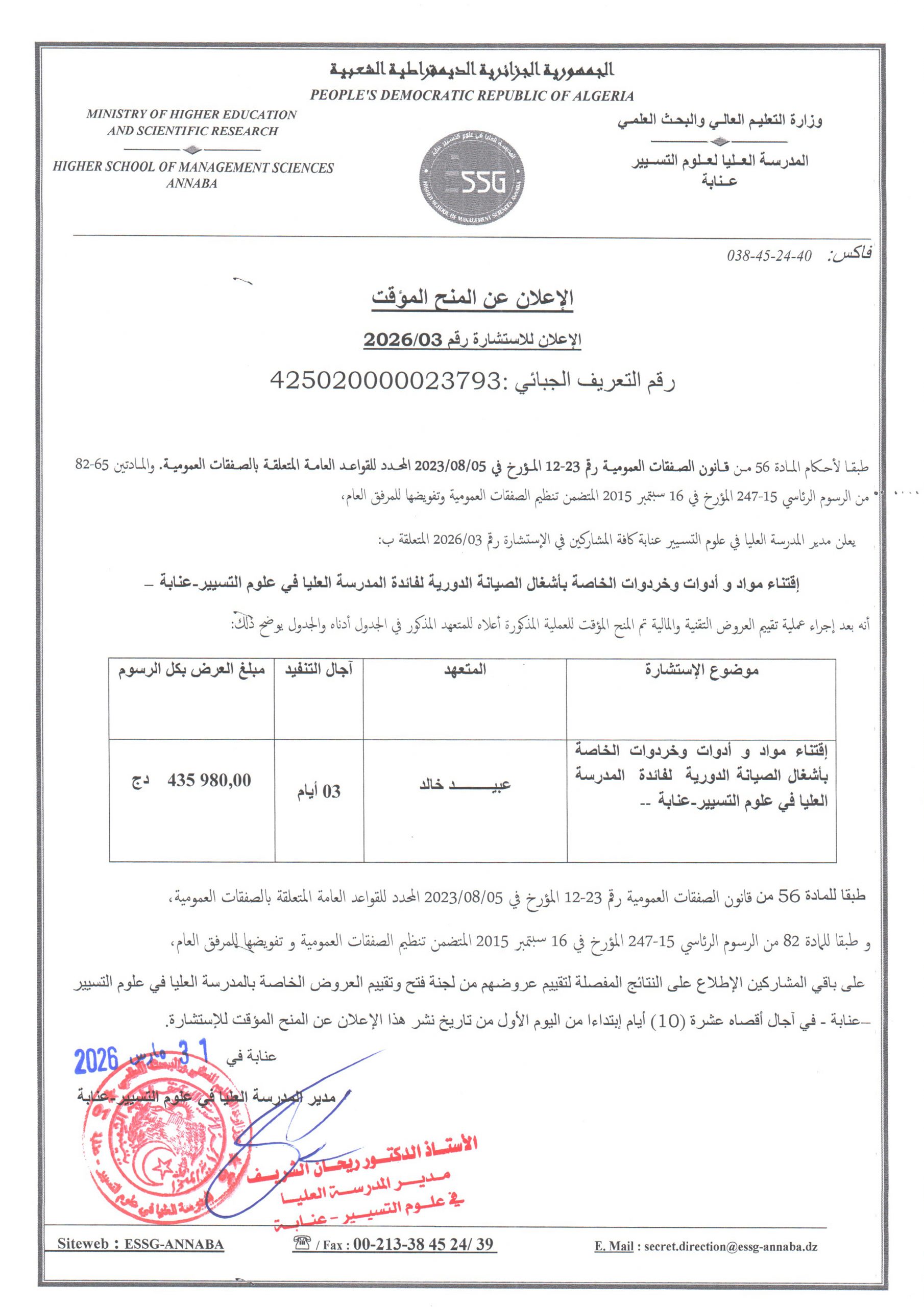 - الإعلان عن المنح المؤقت للإستشارة رقم 2026/03
