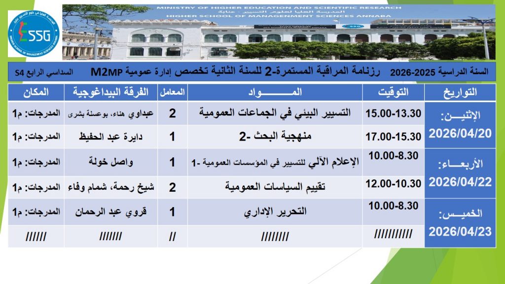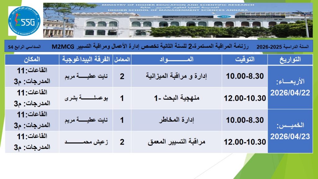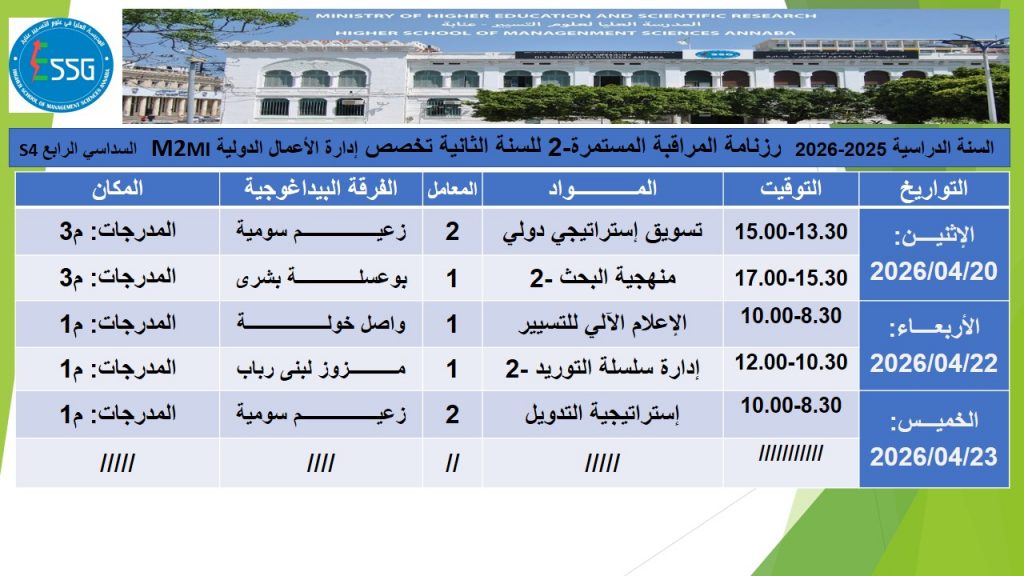 رزنامة المراقبة المستمرة -2 للسنة الثانية تخصصات 2025-2026