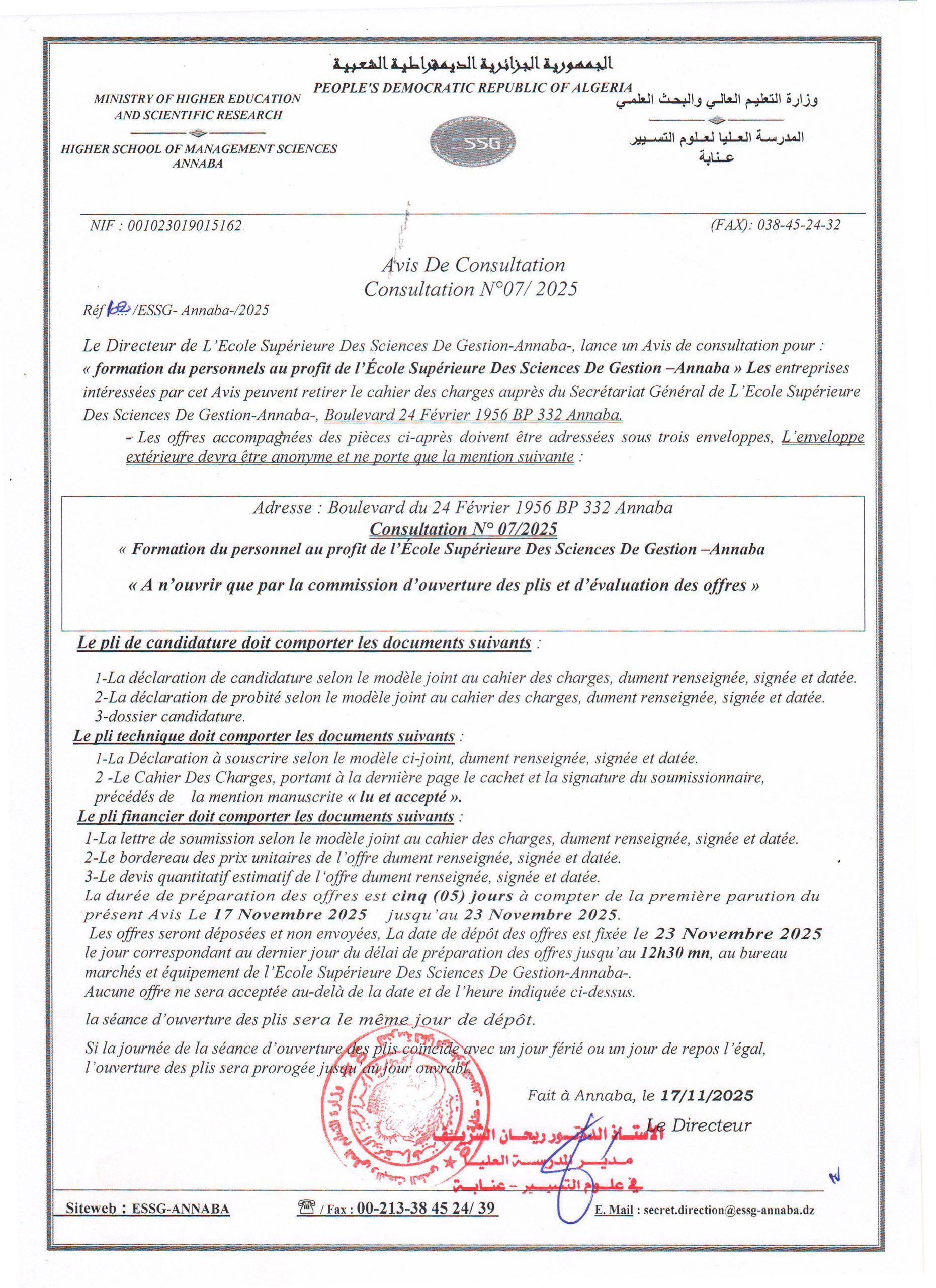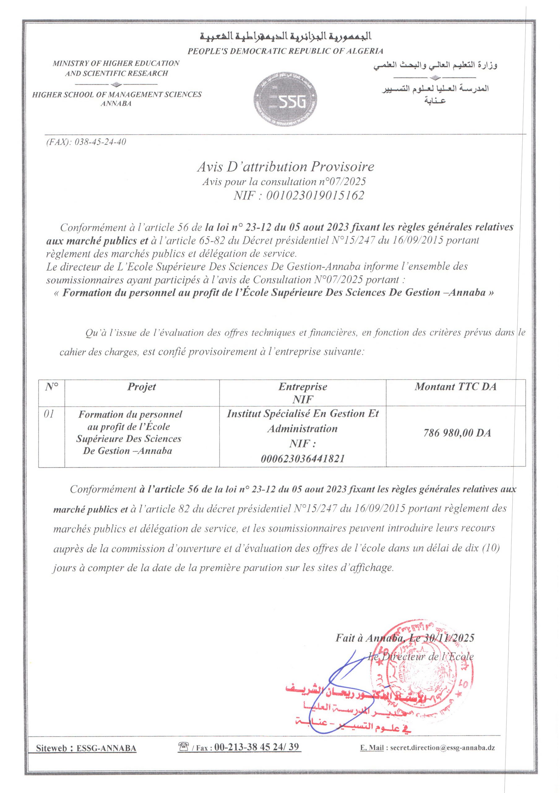 - Avis d’attribution provisoire pour la consultation N° 02/2025